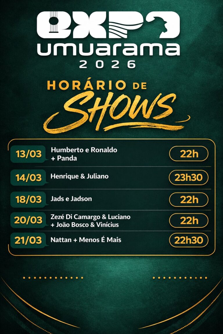 A Sociedade Rural de Umuarama (SRU) divulgou os horários oficiais dos shows da 51ª Expo Umuarama/24ª Internacional, que será aberta