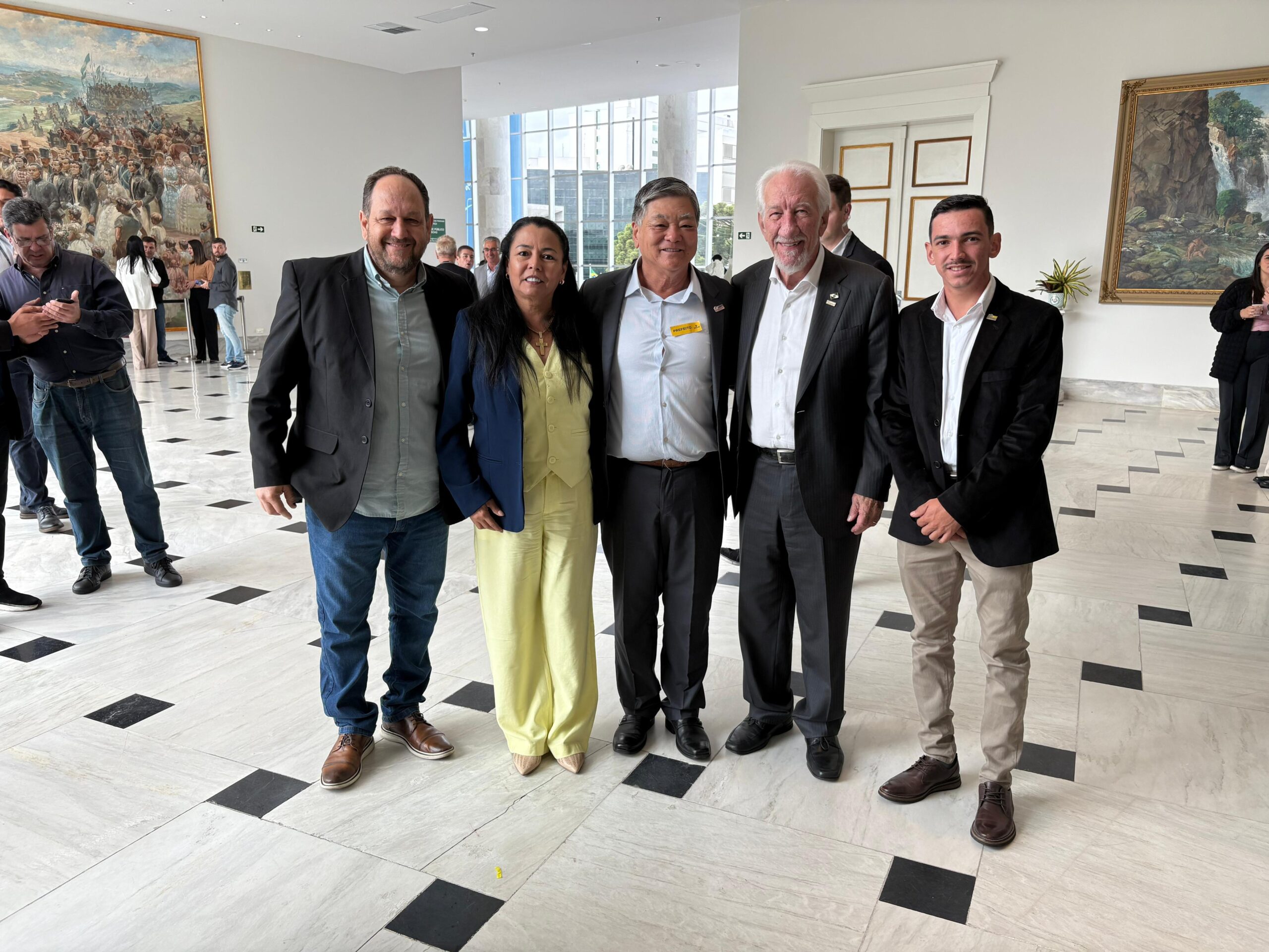 O prefeito Pedro Minoru Inoue, acompanhado da secretária municipal de Assistência Social e primeira-dama, Maria Diniz, e do vereador Gabriel,