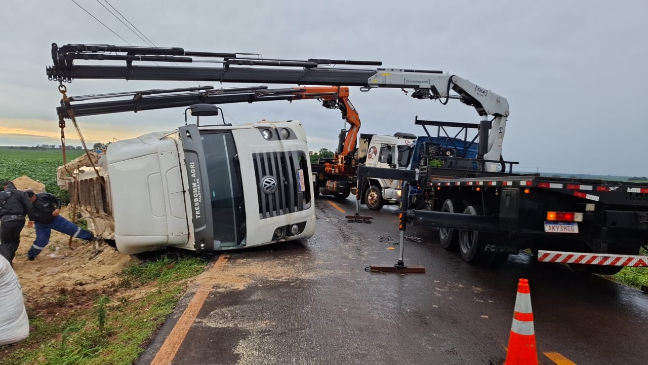 Caminhão carregado de ração tomba e interdita rodovia em Tupãssi