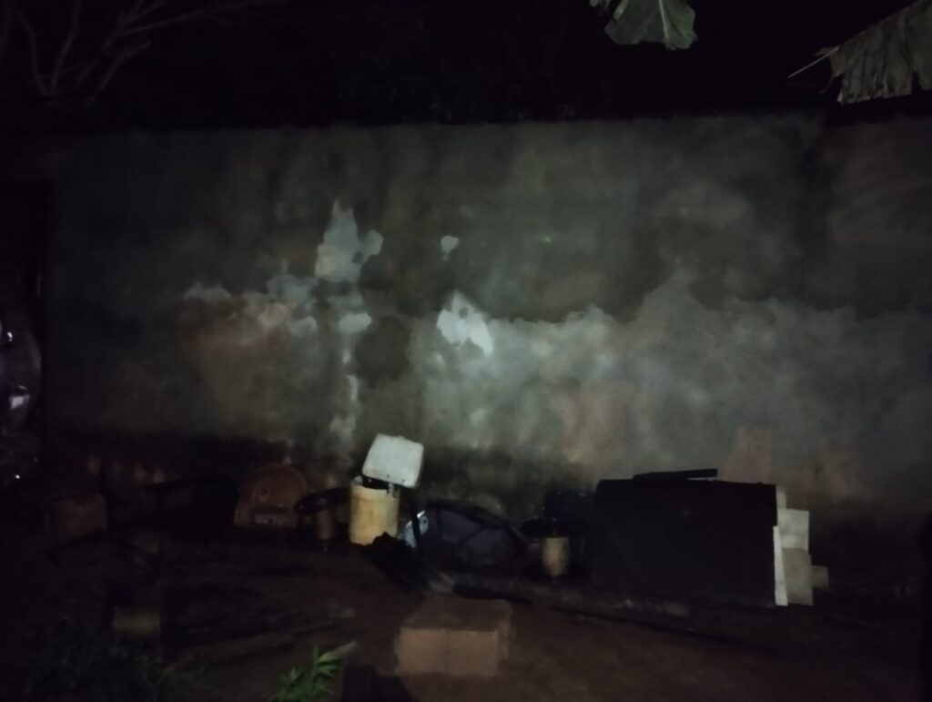Quando os policiais chegaram, o autor do crime já havia fugido. No momento em que os policiais atendiam a ocorrência foram informados, que o mesmo estava armado com uma faca e ameaçando pedestres em via pública, mas quando os policias chegaram ao local informado ele havia retornado ao local da casa em chamas e ameaçava a mãe, inclusive, jogando pedras contra a mesma e outra mulher de 26 anos (grau de parentesco não informado). O policias retornaram ao local, e pouco tempo depois localizaram o homem no pátio do Hospital Municipal, armado com uma faca. Ele foi detido e encaminhado para a delegacia para as medidas cabíveis.