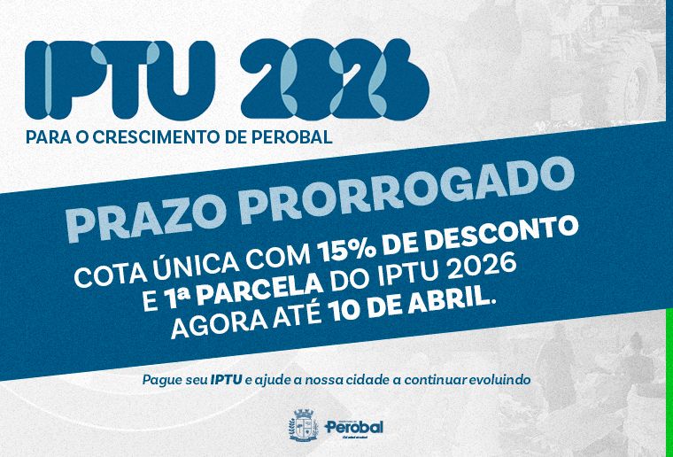 A Prefeitura de Perobal prorrogou o prazo para o pagamento do IPTU 2026 (Imposto Predial e Territorial Urbano), oferecendo mais tempo para que os contribuintes possam regularizar o tributo e aproveitar o desconto.